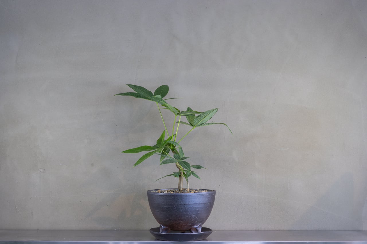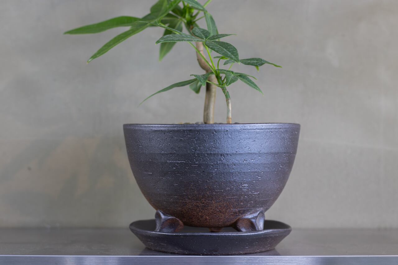 丸十製陶の植木鉢M(黒)に植え込み、受皿と合わせての販売になります。