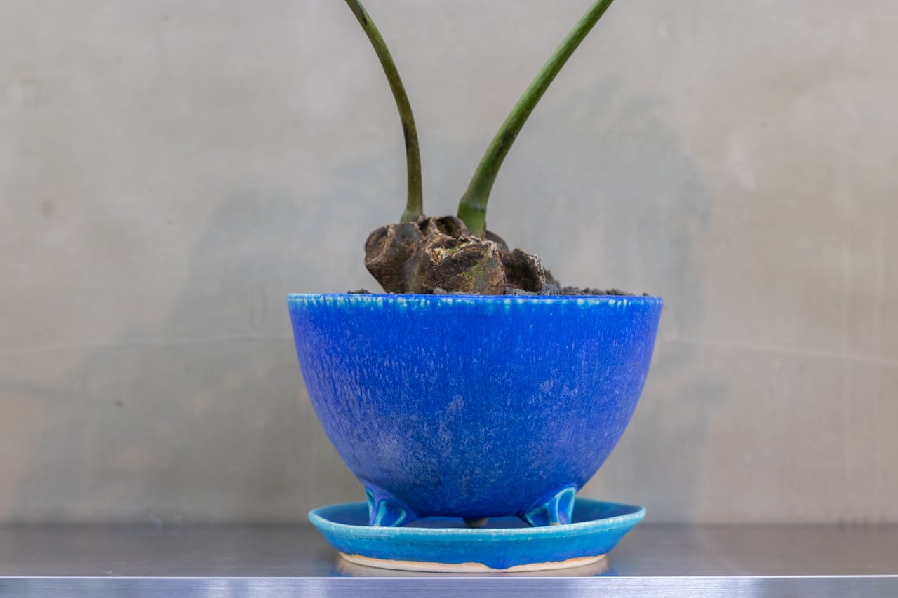 丸十製陶の植木鉢M(ターコイズ)に植え込み、受皿と合わせての販売になります。
