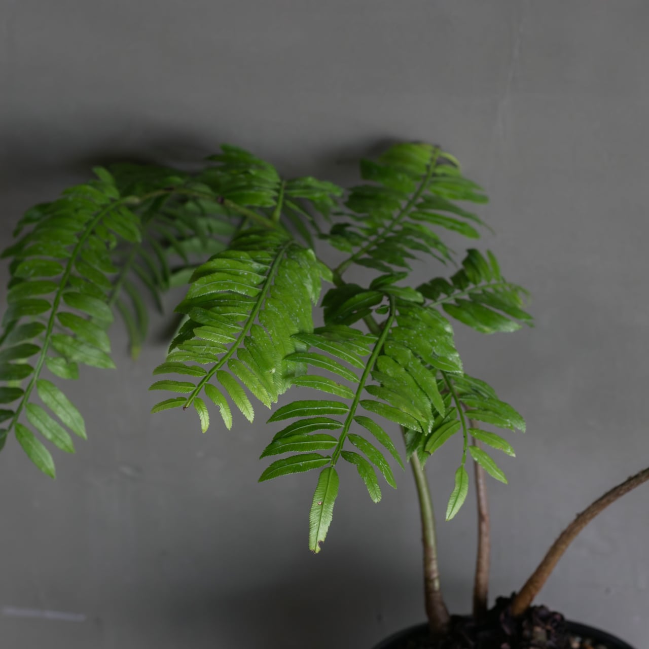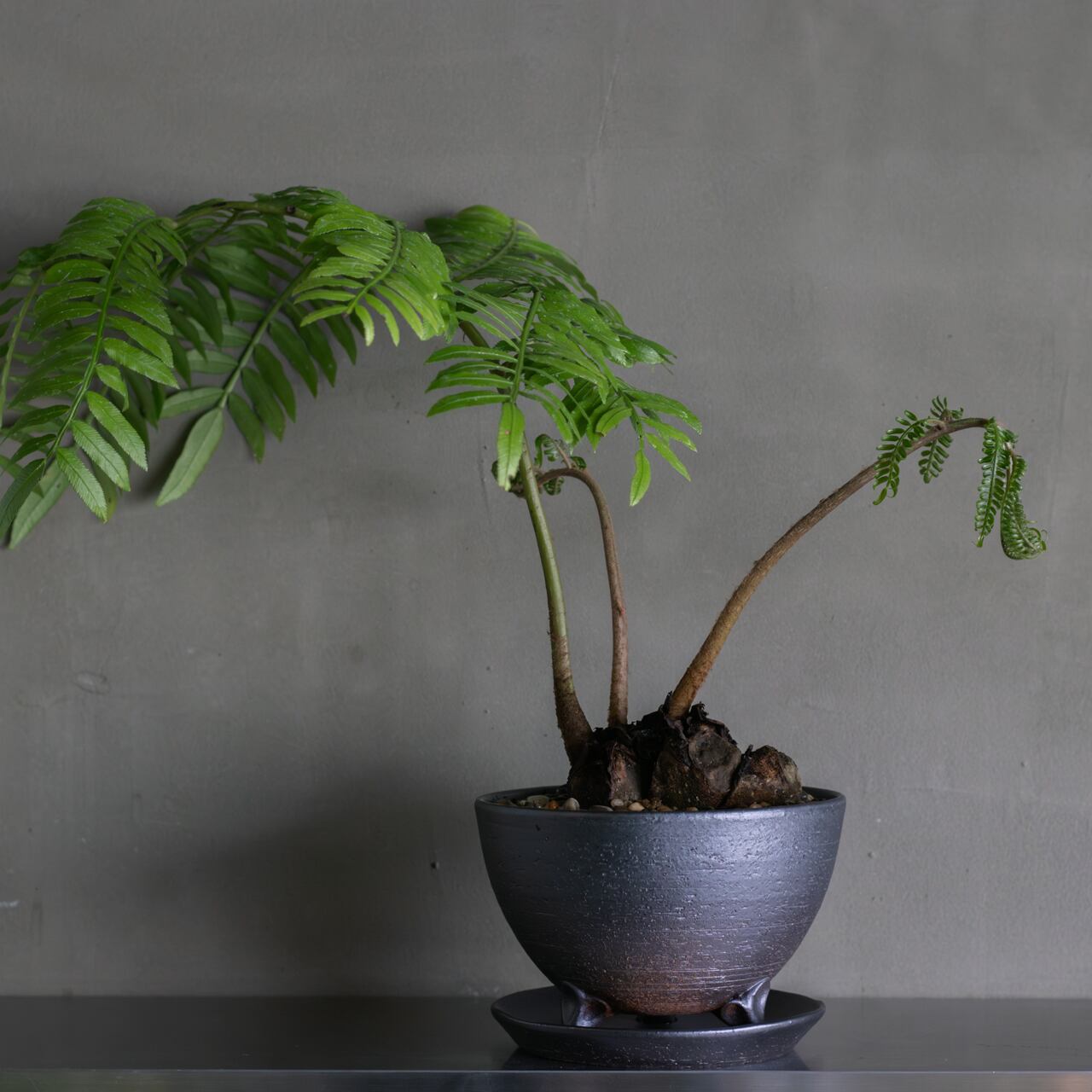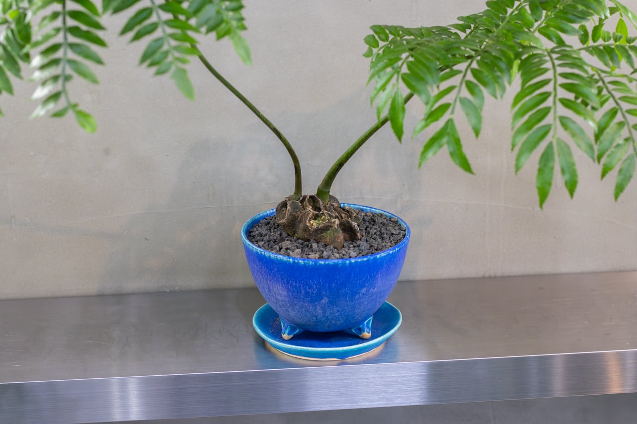 ゴツゴツした岩のような株元から、ゼンマイのように渦を巻いた新芽を出し、羽のように美しく広がる葉を持つシダ植物です。