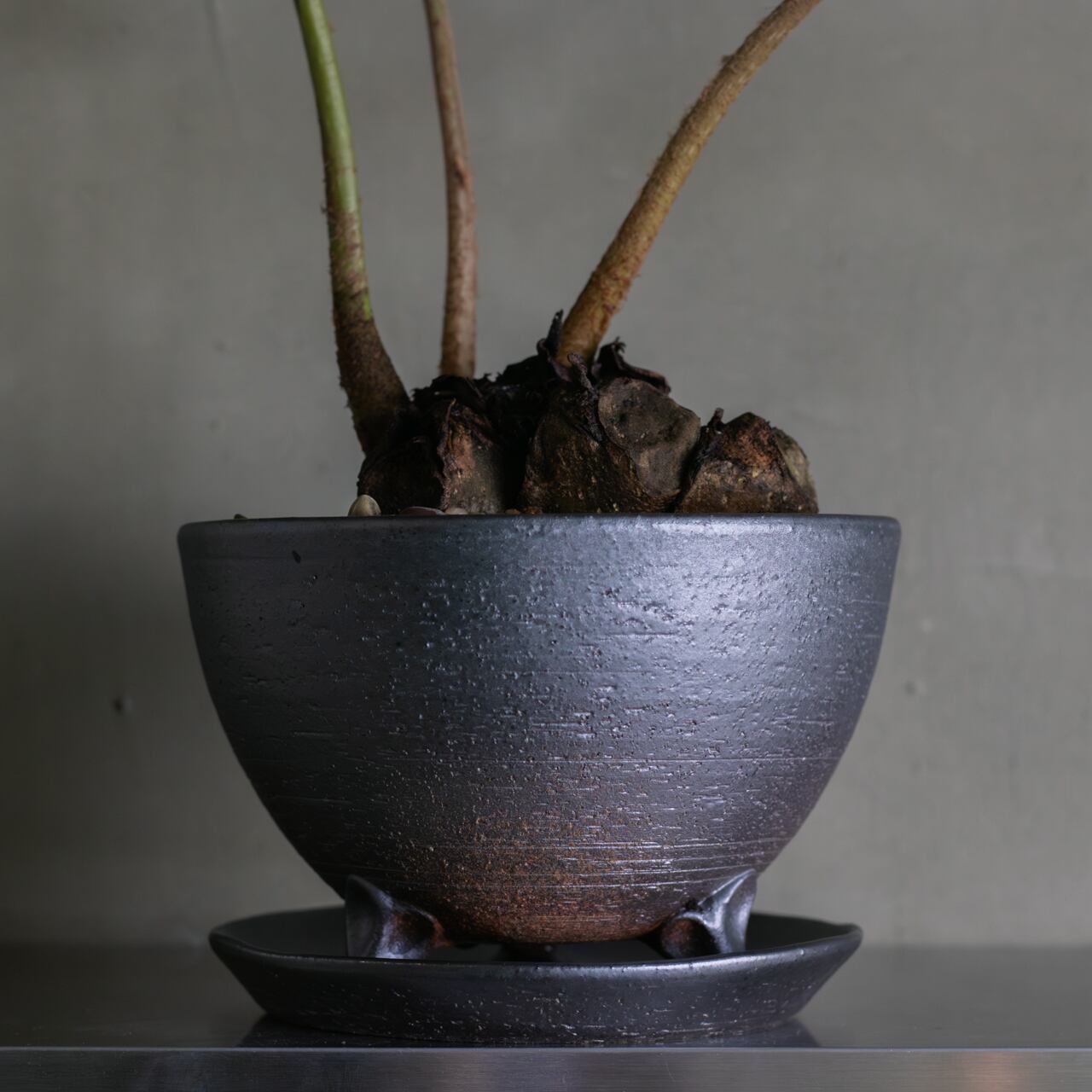 丸十製陶の植木鉢M(黒)に植え込み、受皿と合わせての販売になります。