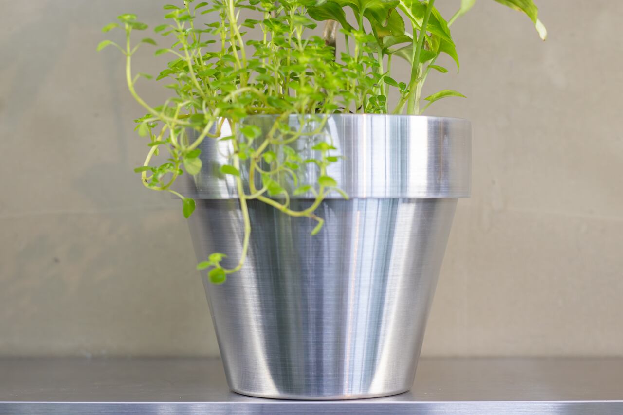 2011年にグッドデザイン賞を受賞したワンポッツ。ひとつひとつ、日本のヘラ絞り職人の手によって製作されています。一見ふつうの植木鉢ですが、重なり合う二つの部品で成り立っており、受け皿のいらない植木鉢です。