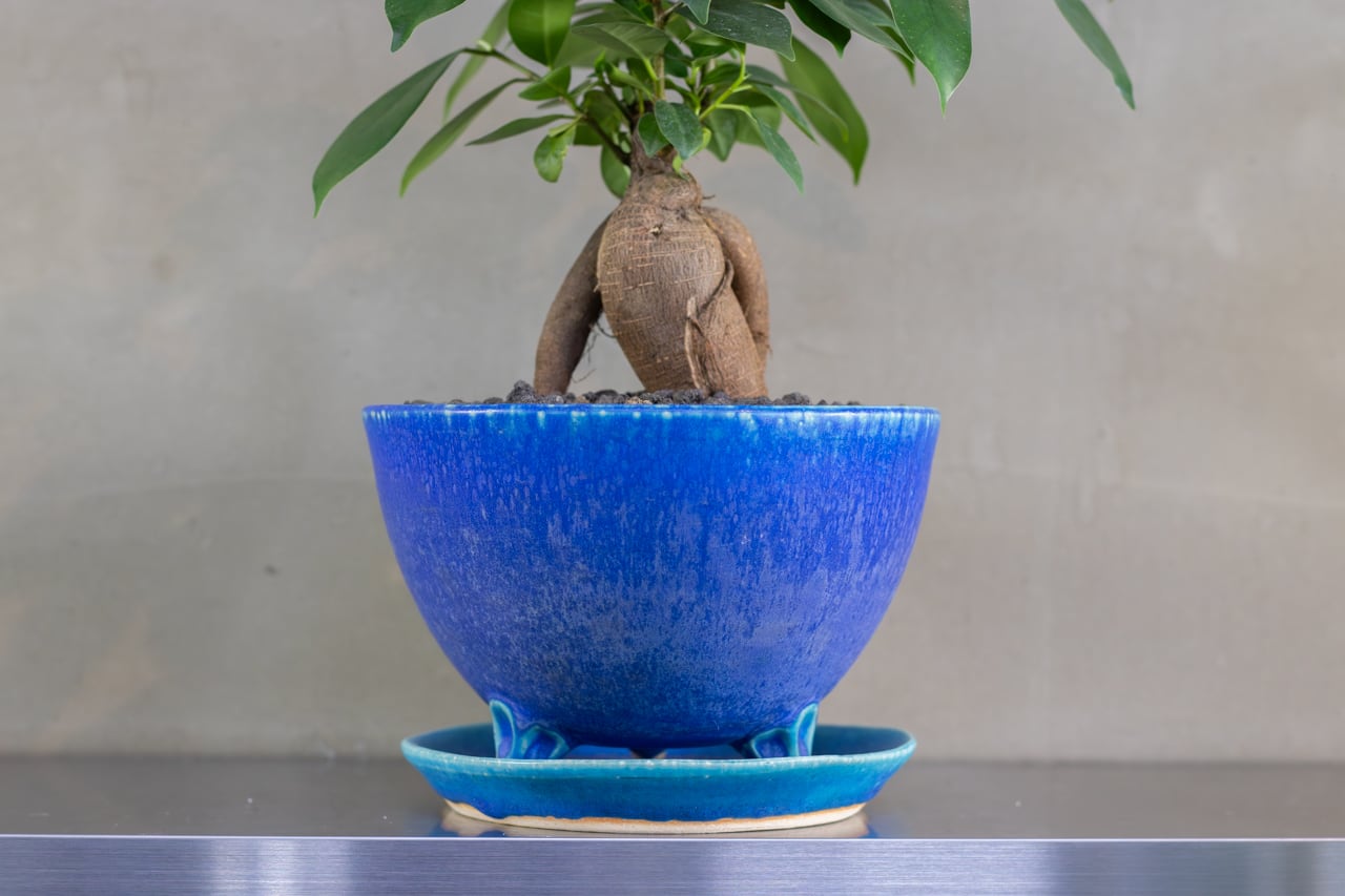 丸十製陶の植木鉢M(ターコイズ)に植え込み、受皿と合わせての販売になります。