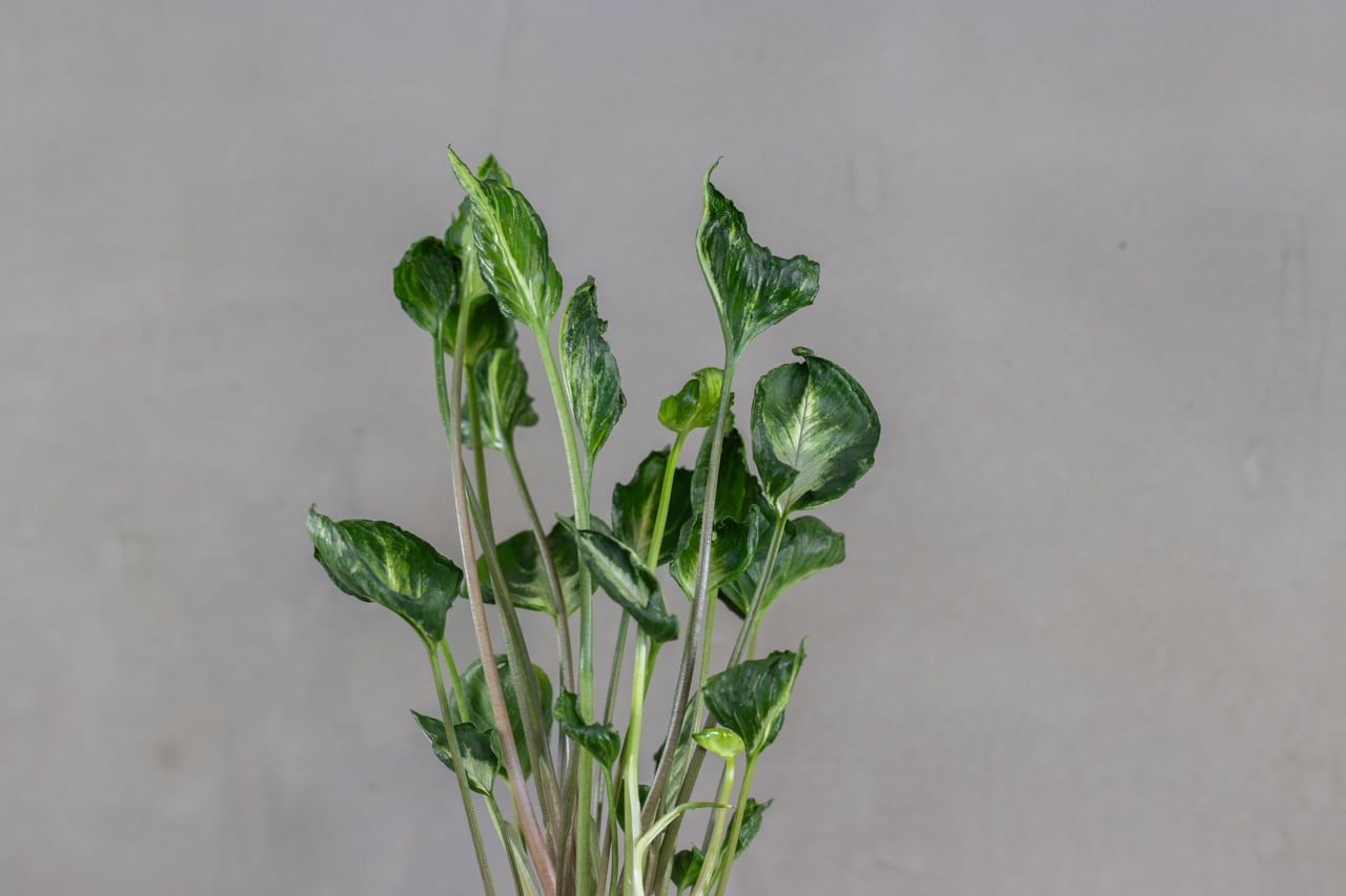 その名の通り、縮れたハート型の葉が特徴の、希少で個性的な観葉植物です。淡い緑の葉にクリーム色の斑がランダムに入り、まるで水彩画のような美しさがあります。