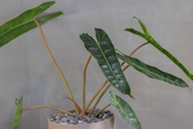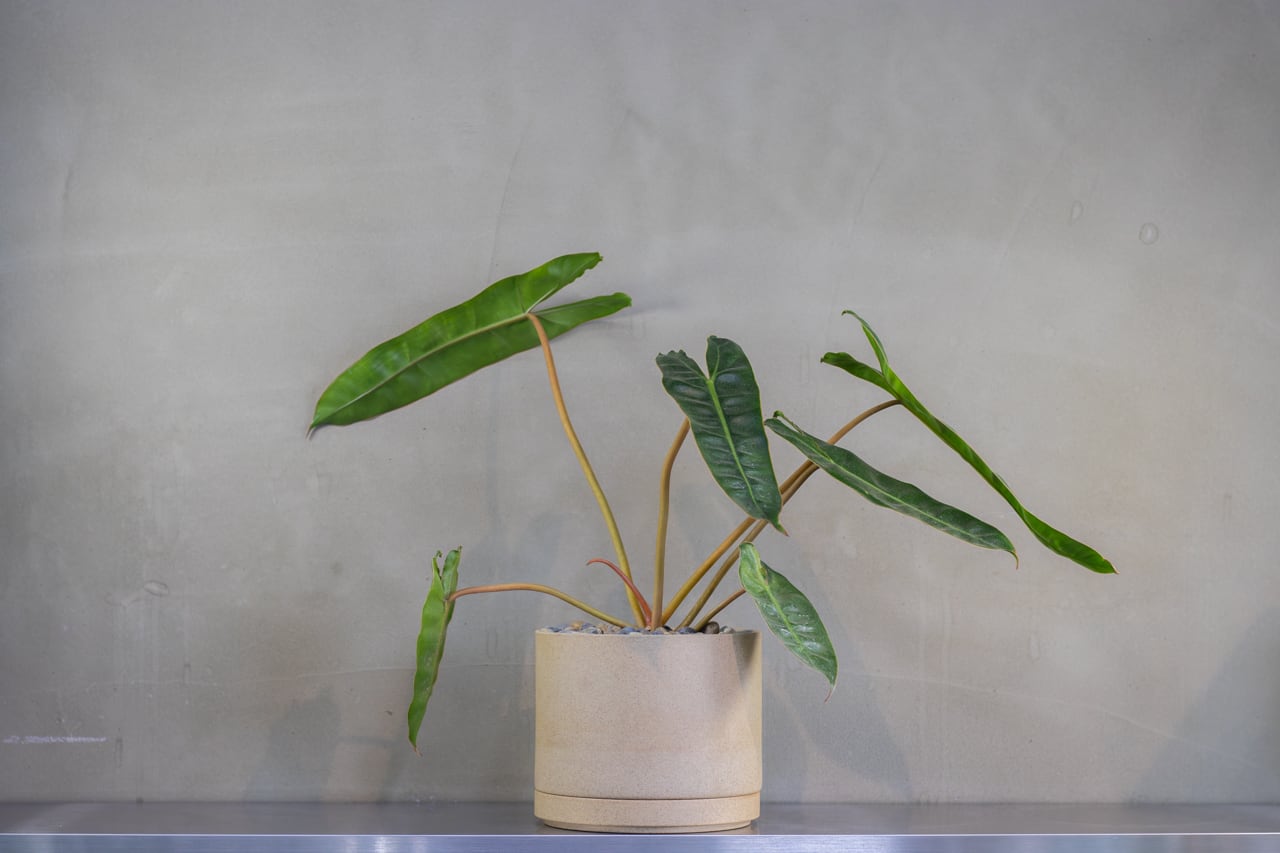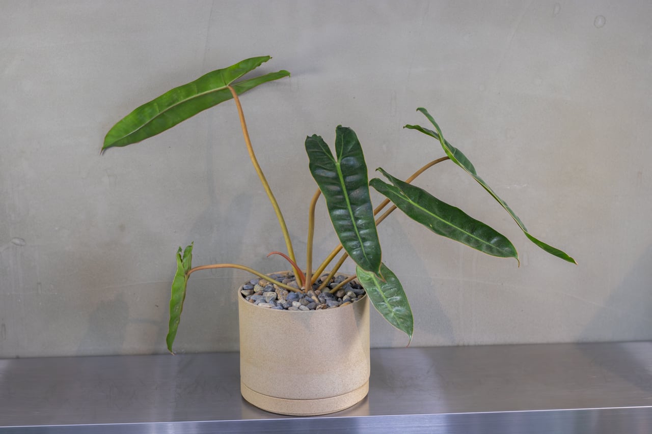 光沢のある深緑のハート型の葉と、オレンジや黄色の茎とのコントラストが綺麗なフィロデンドロンです。