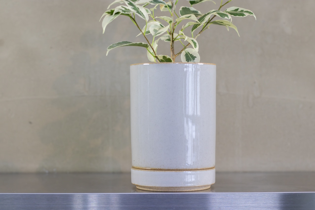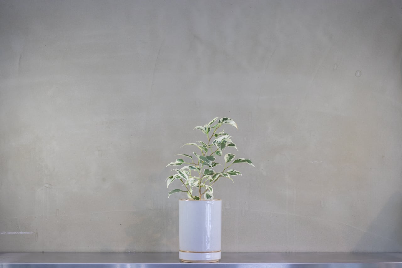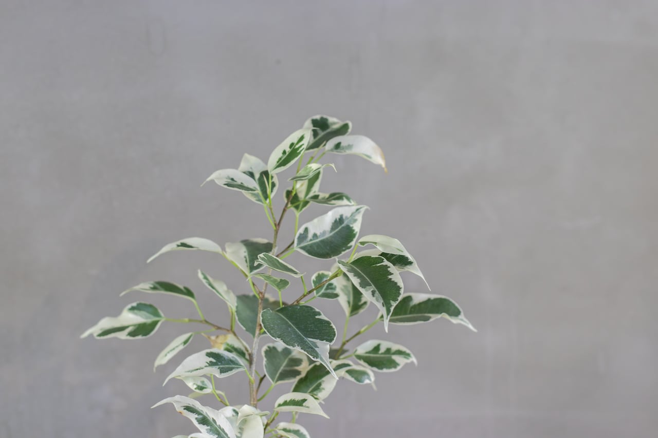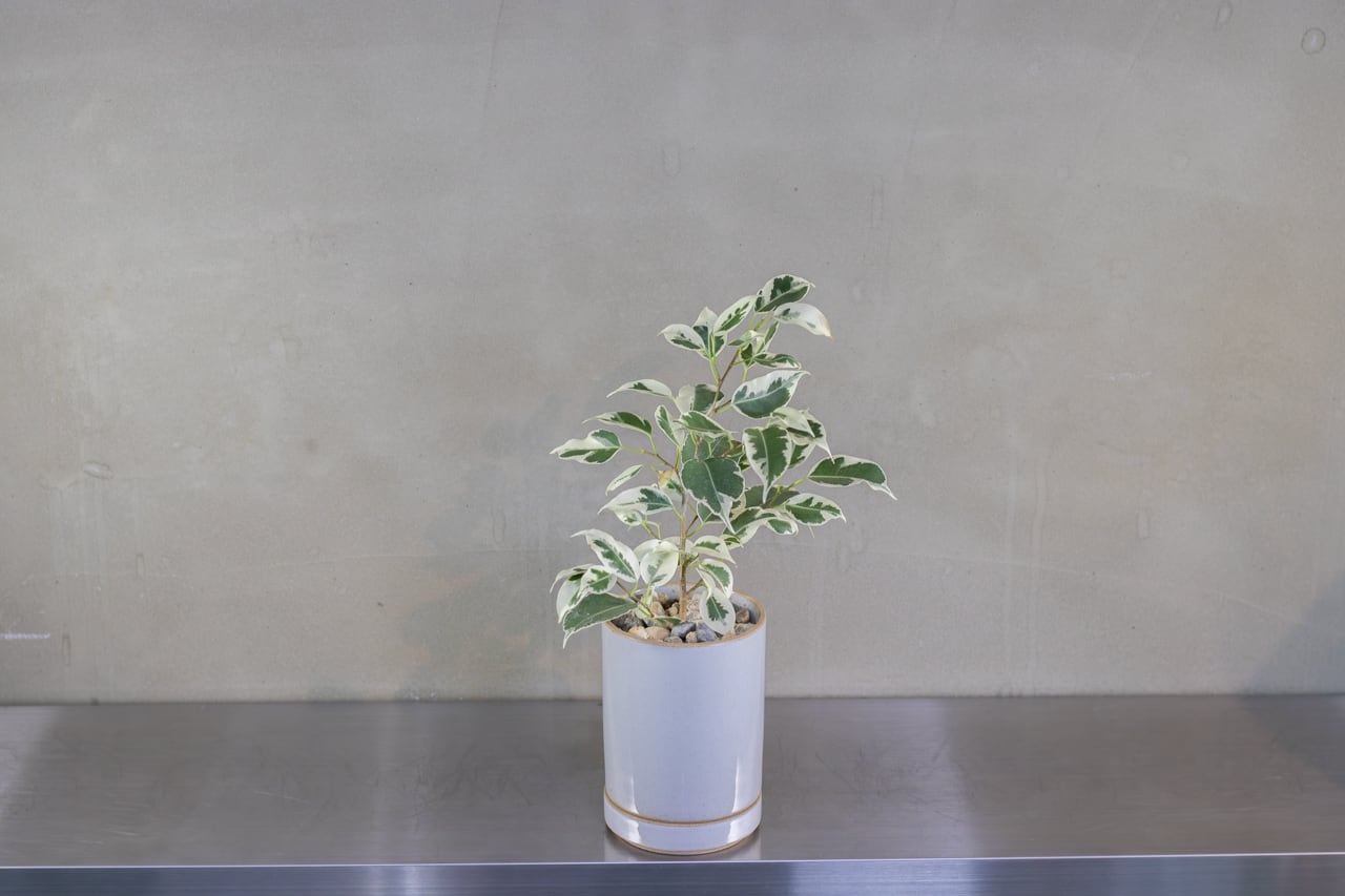 ベンジャミンはゴムの木の一種で、光沢のある小さな葉が特徴的。白の斑入りはとても綺麗で、可愛らしいサイズのベンジャミンです。