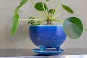 丸十製陶の植木鉢S(ターコイズ)に植え込み、受皿と合わせての販売になります。