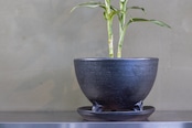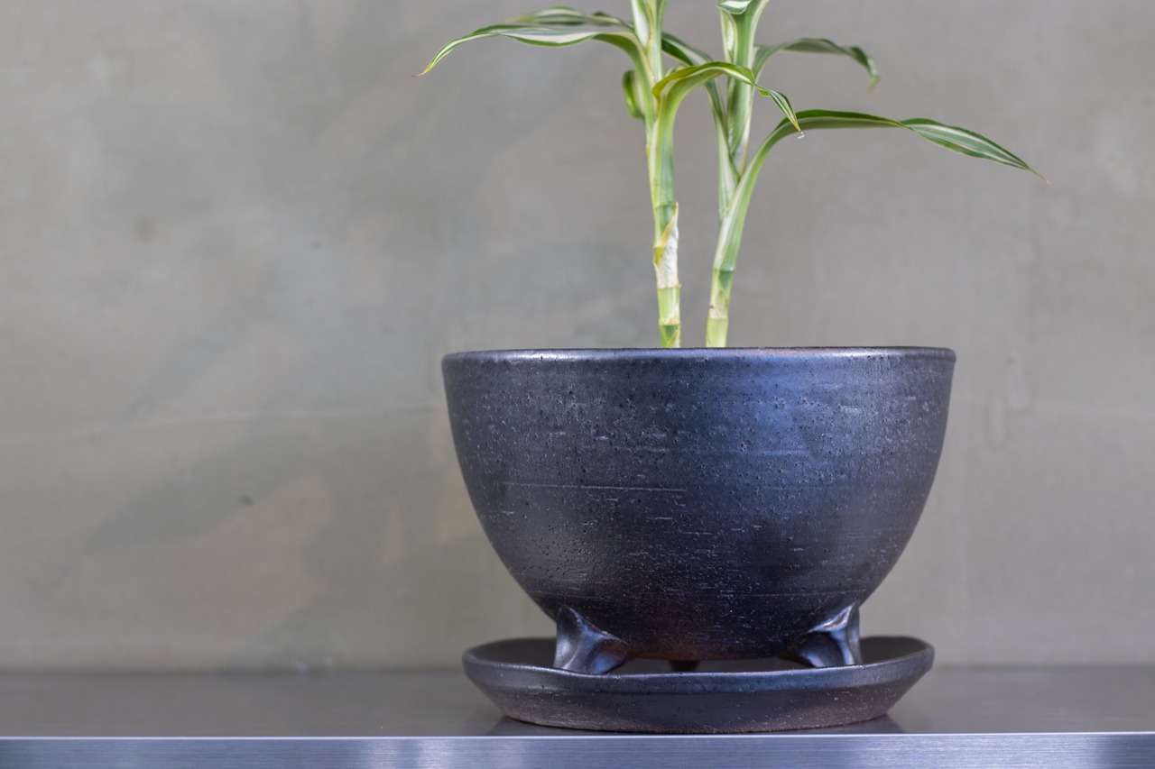 丸十製陶の植木鉢M(黒)に植え込み、受皿と合わせての販売になります。