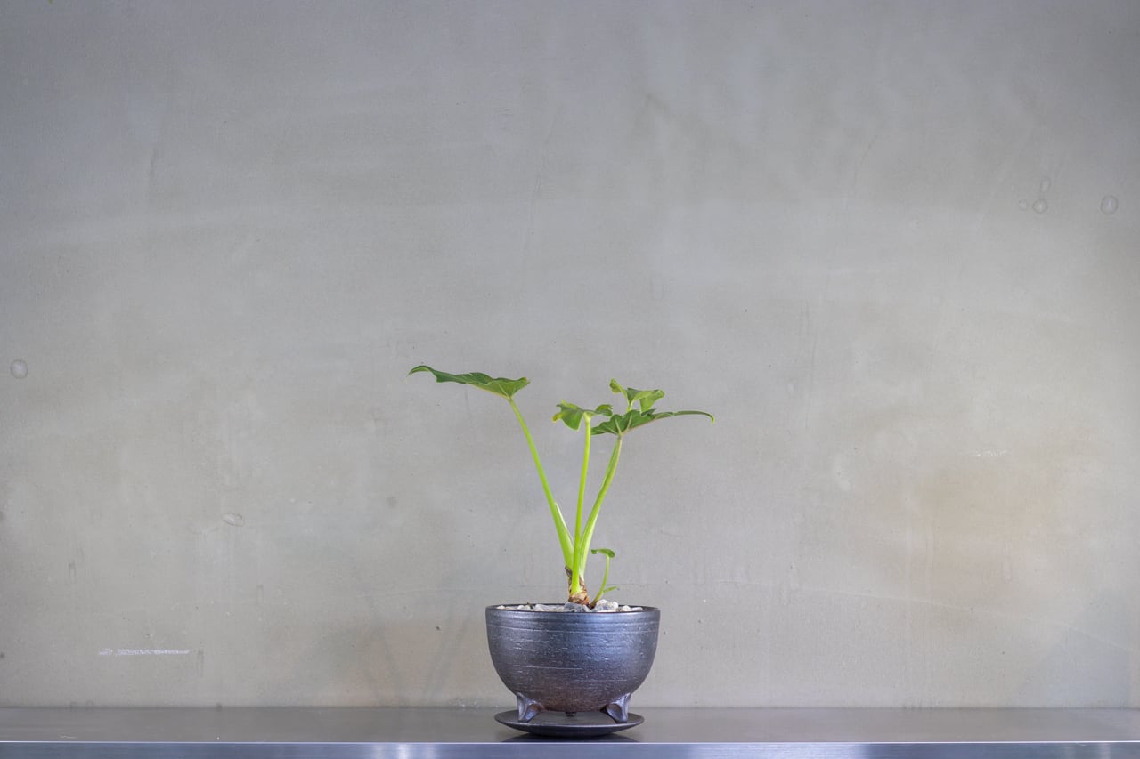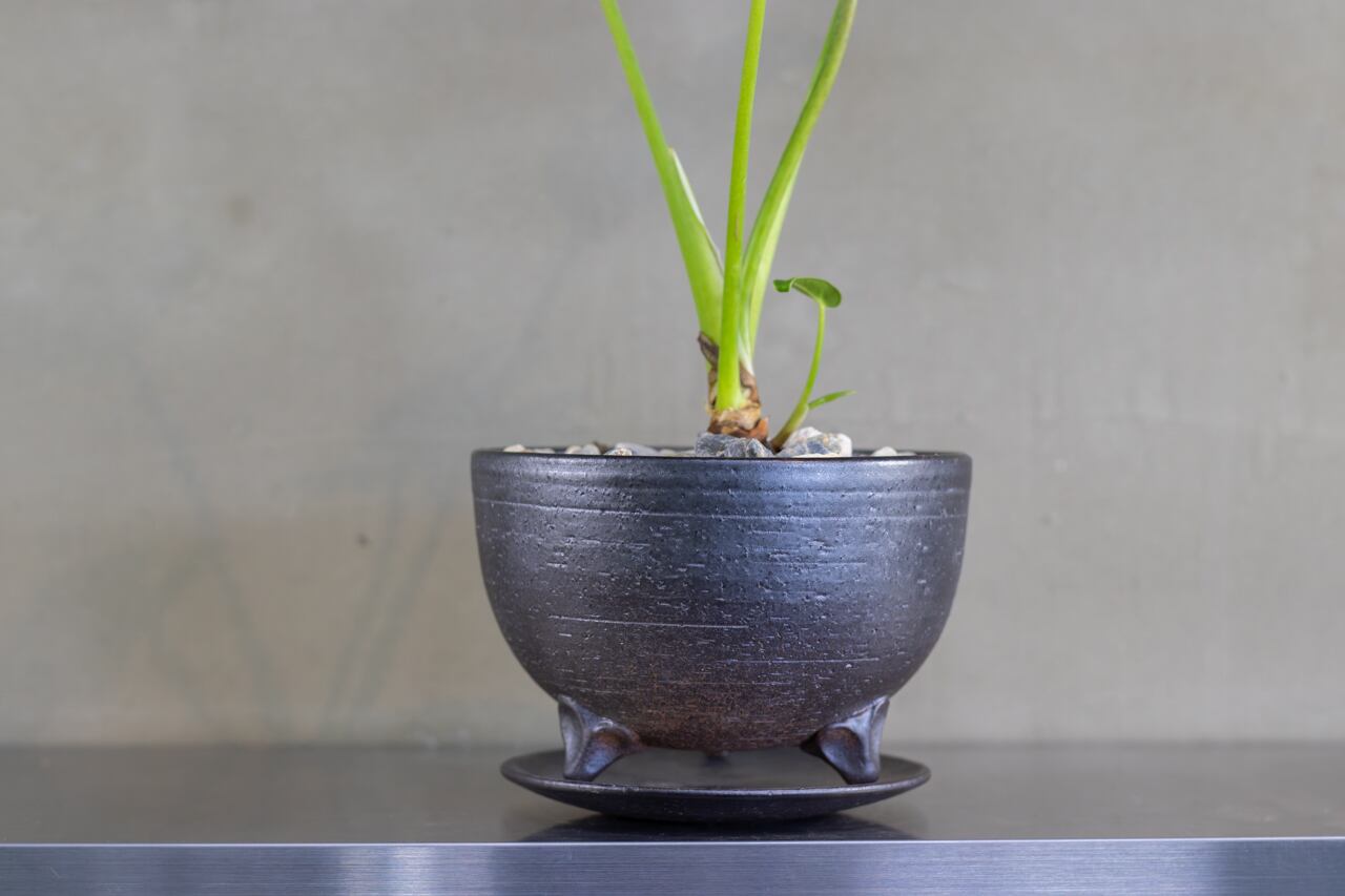 丸十製陶の植木鉢S(黒)に植え込み、受皿と合わせての販売になります。