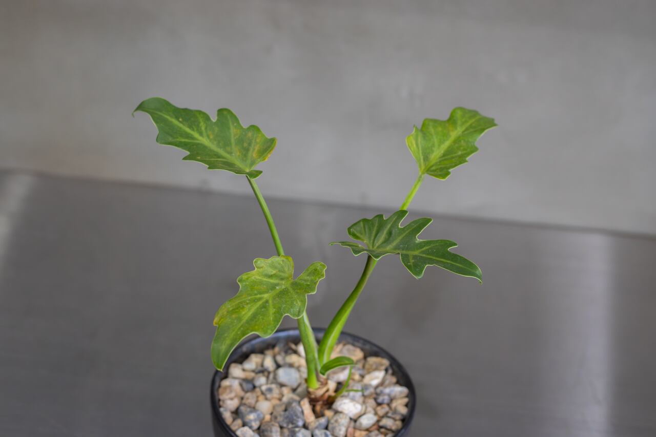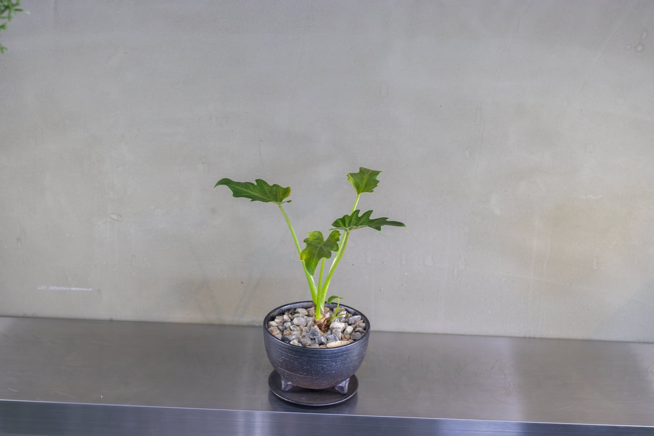 切れ込みのある深緑色の葉を四方に伸ばす姿が特徴的なクッカバラ。幹立ちになるにつれ迫力も増していきます。
