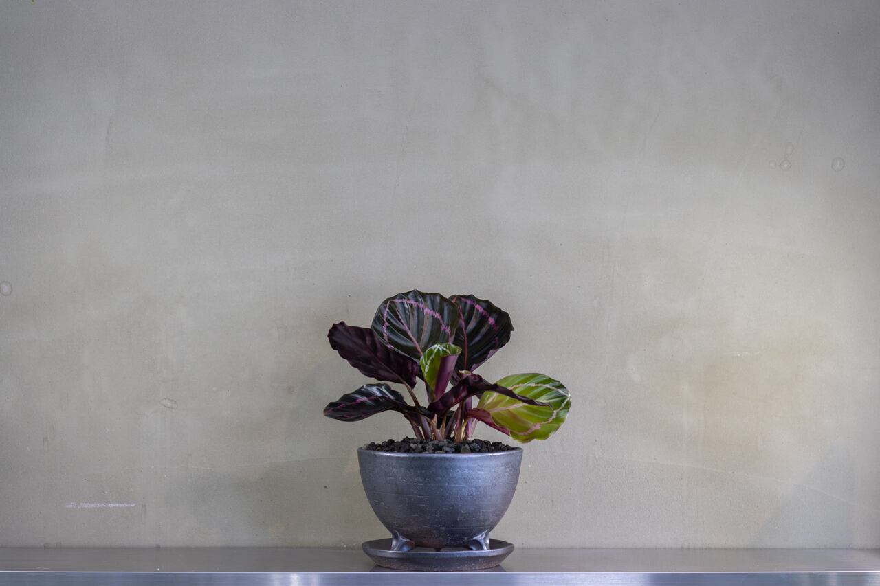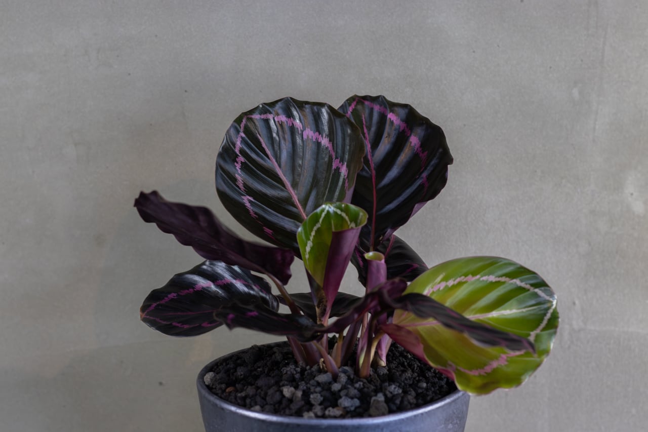 深いグリーンに映えるピンクの縁取りと、裏面の濃いパープル、一枚一枚がアートのような存在感を放つカラテア。祈りの植物と呼ばれ、夜は葉を立ち上げ朝に広げる姿も魅力です。