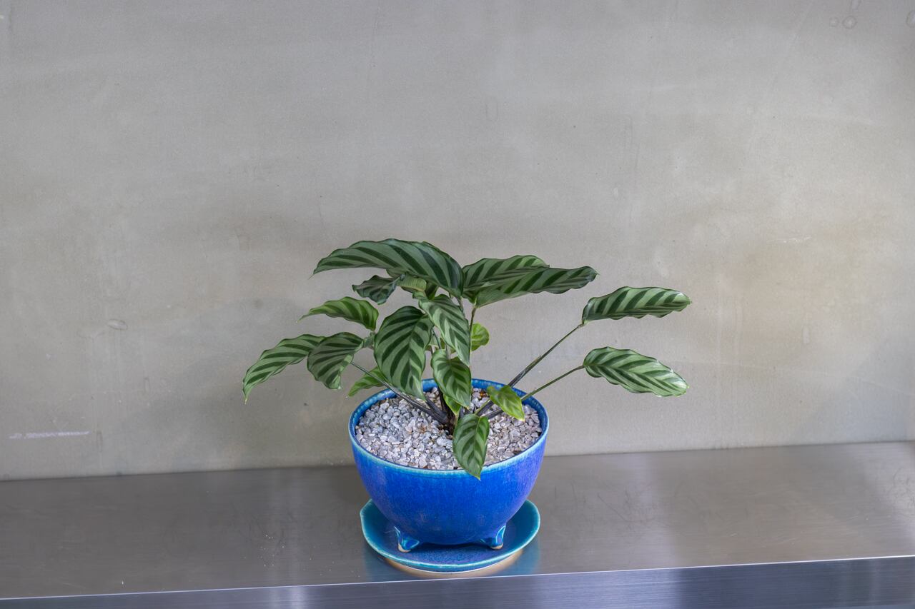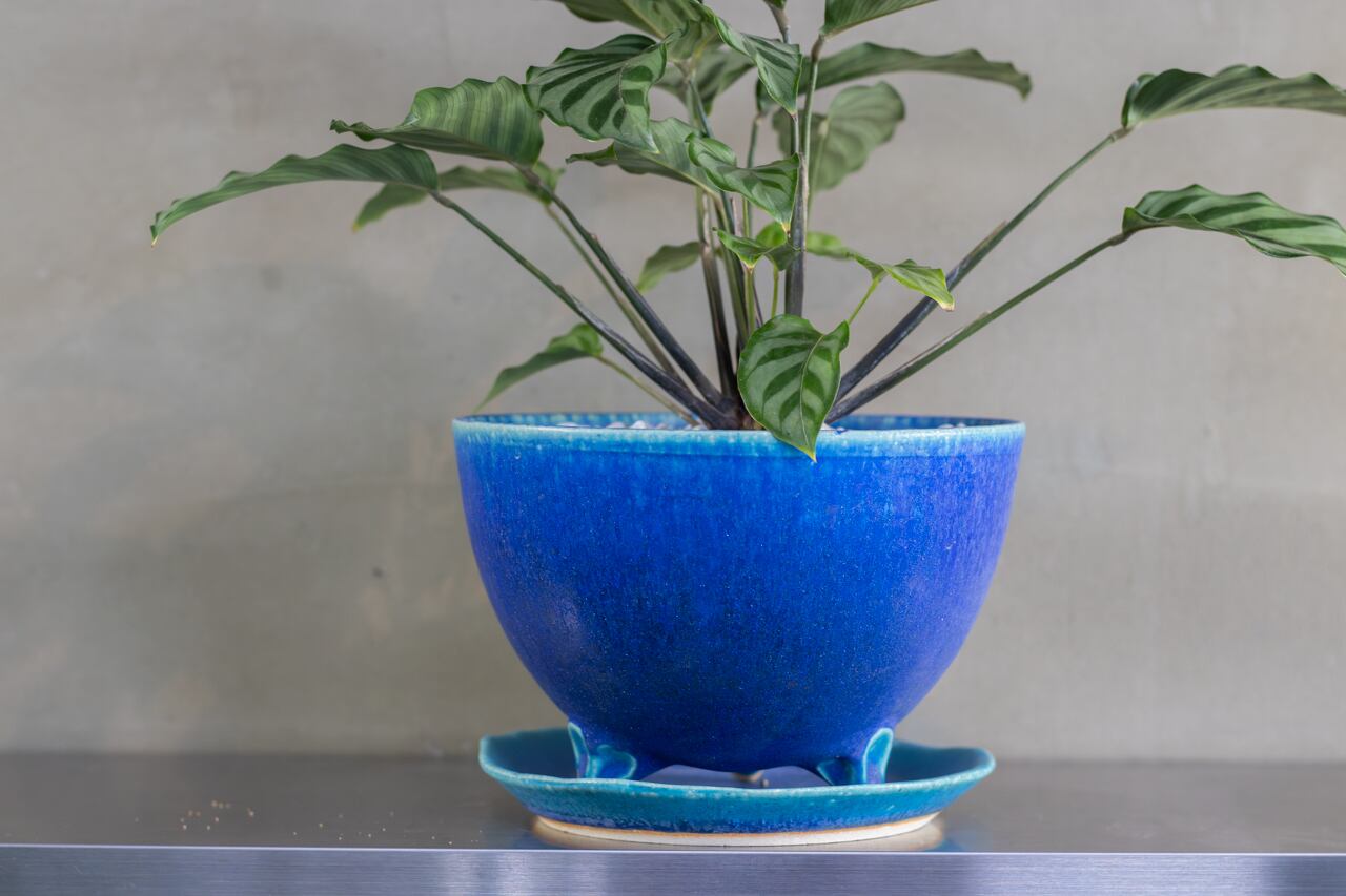 丸十製陶の植木鉢M(ターコイズ)に植え込み、受皿と合わせての販売になります。