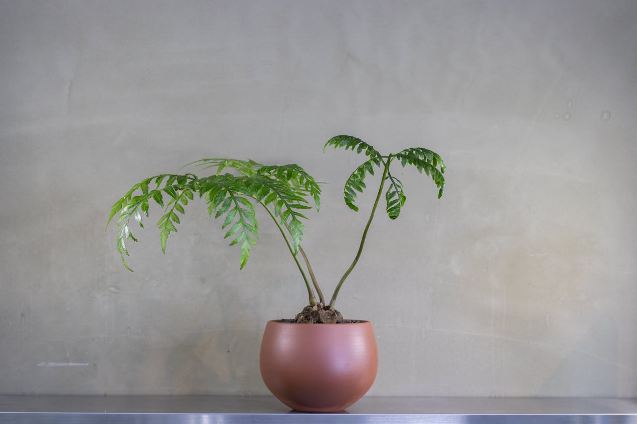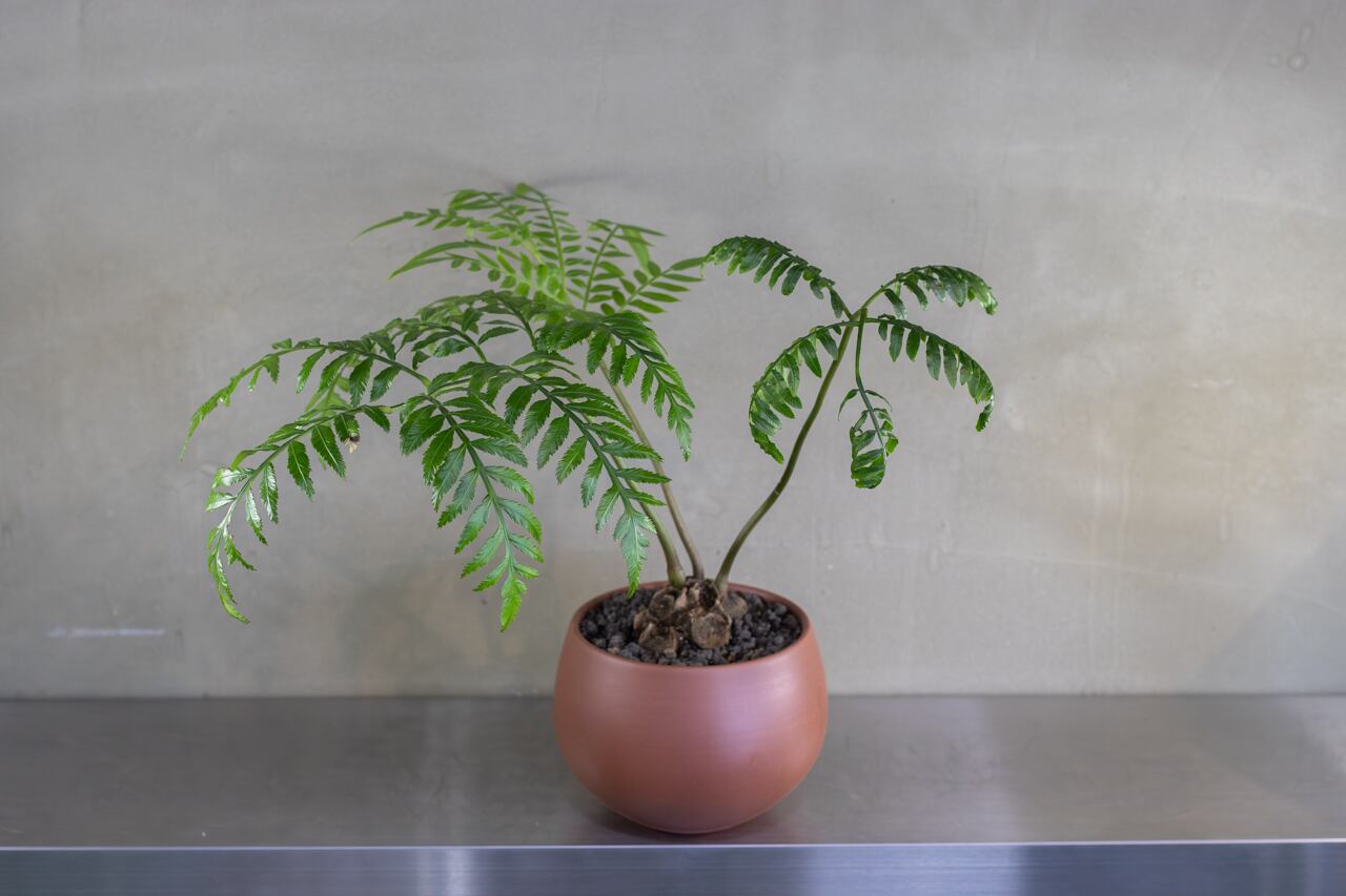 ゴツゴツした岩のような株元から、ゼンマイのように渦を巻いた新芽を出し、羽のように美しく広がる葉を持つシダ植物です。