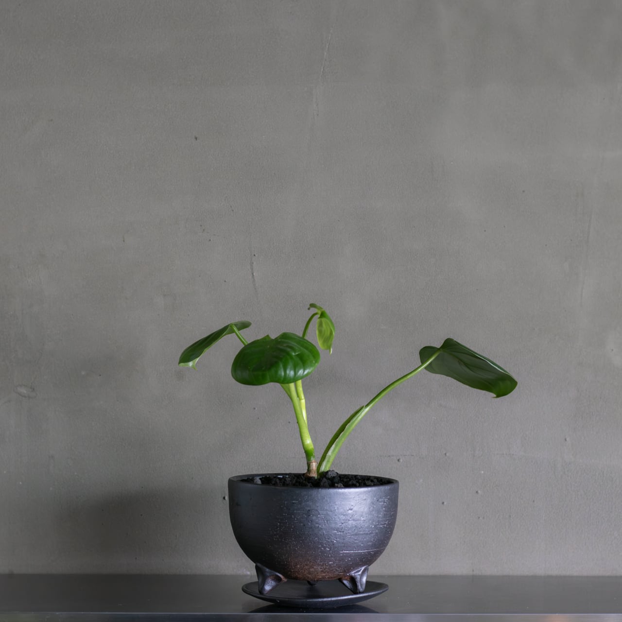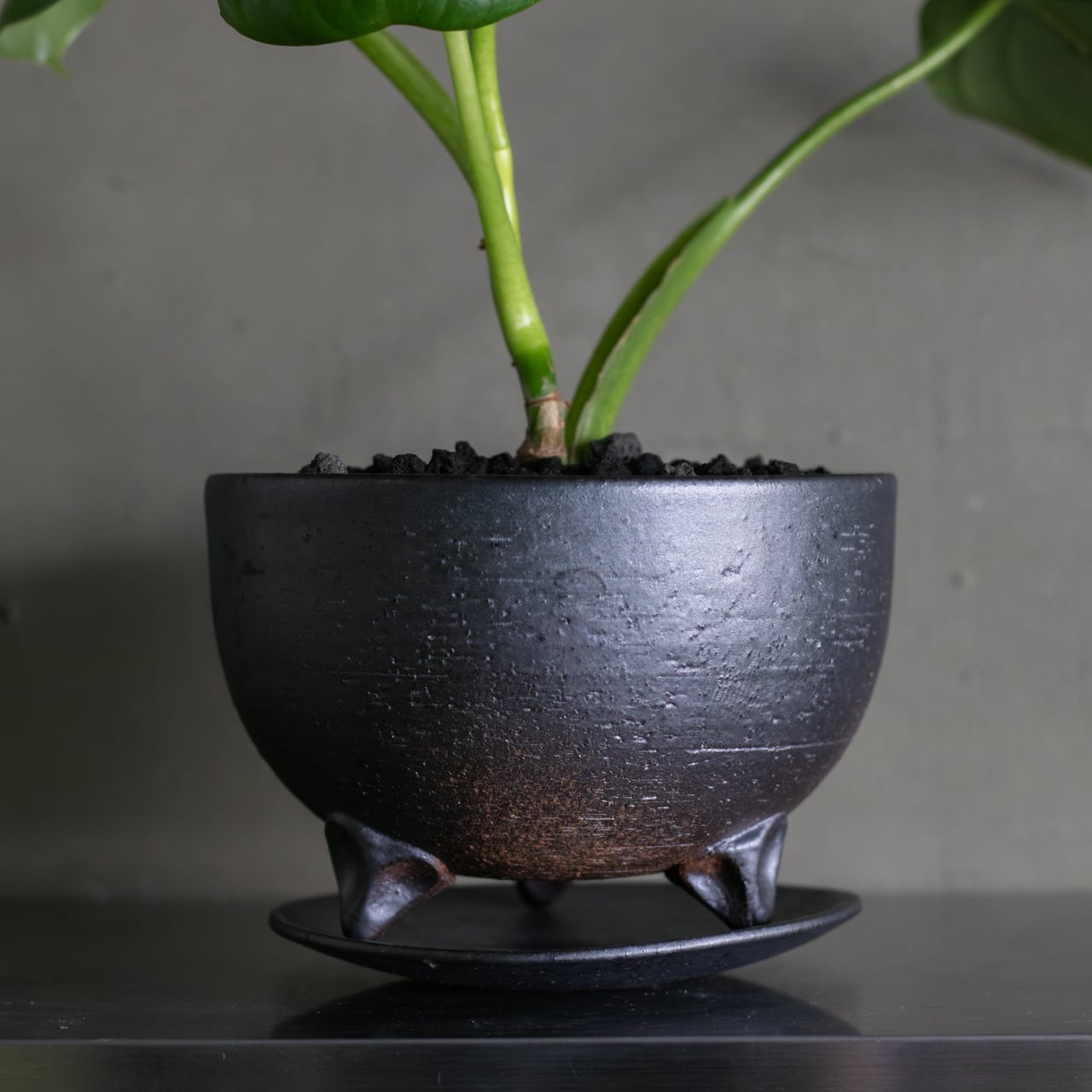 丸十製陶の植木鉢S(黒)に植え込み、受皿と合わせての販売になります。