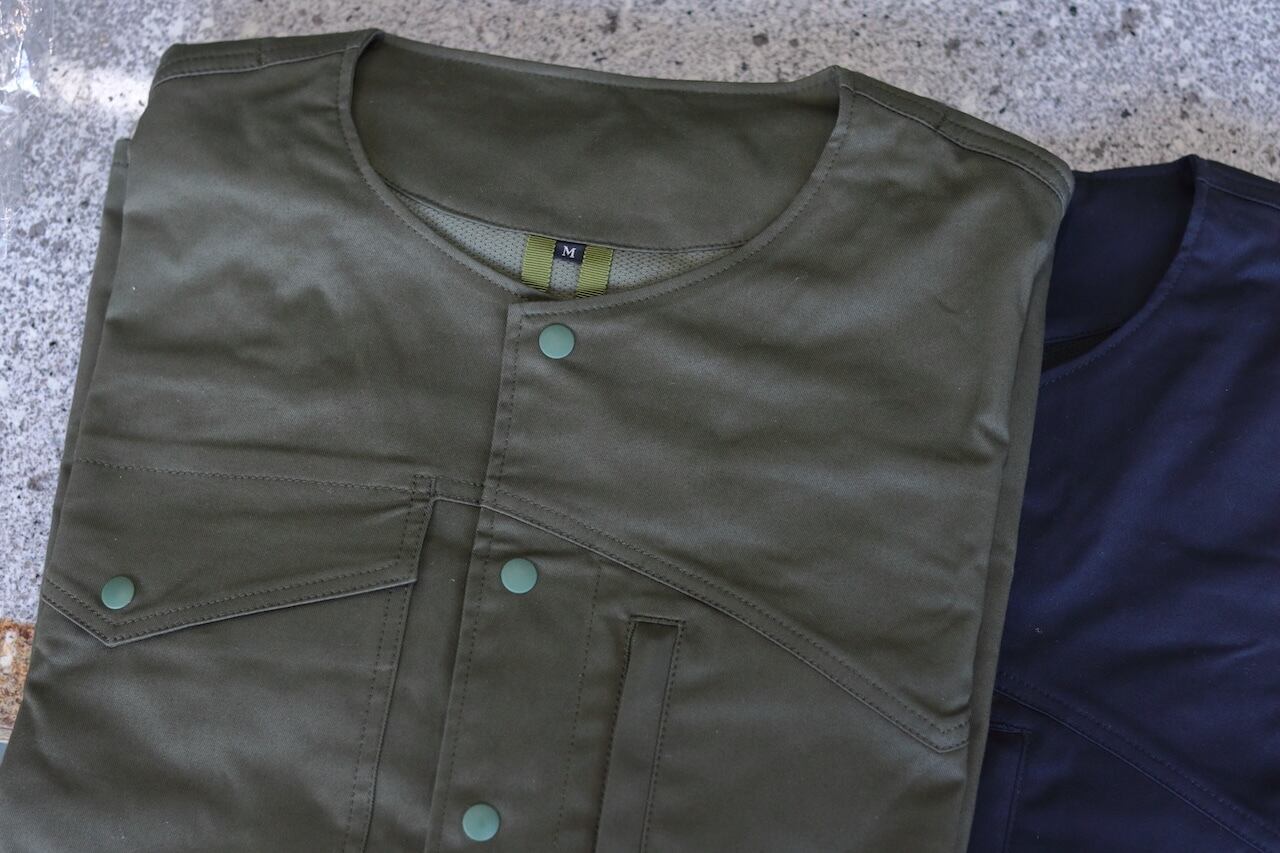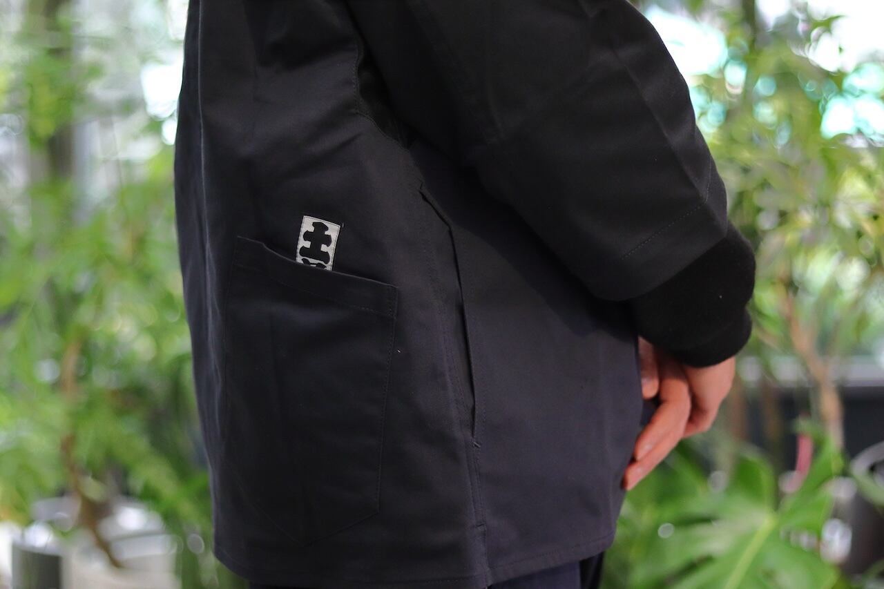 半纏や鯉口シャツを長らく着用したことでわかった短めの袖、背中のベンチレーション、脇のメッシュ、スナップボタンなど実際の現場作業からの機能が投影されています。その他両胸には左右非対称でフラップポケットとジップポケットを配し、両腰にはスリットポケット、右背面にパッチポケットを付けるなど、収納力もタップリ。中肉厚で横両方向ストレッチのチノクロス。ポリウレタン5%は一般的な1~2%より遥かにストレッチ性が高く、動きやすさと快適さを兼ね備えています。