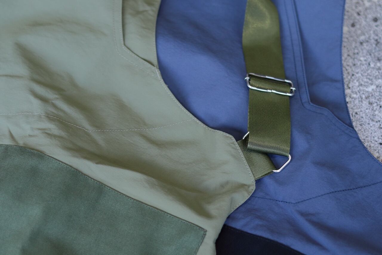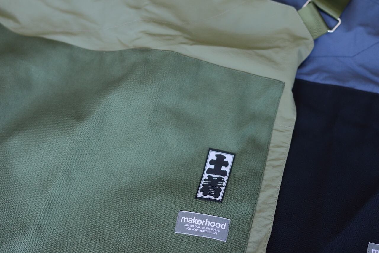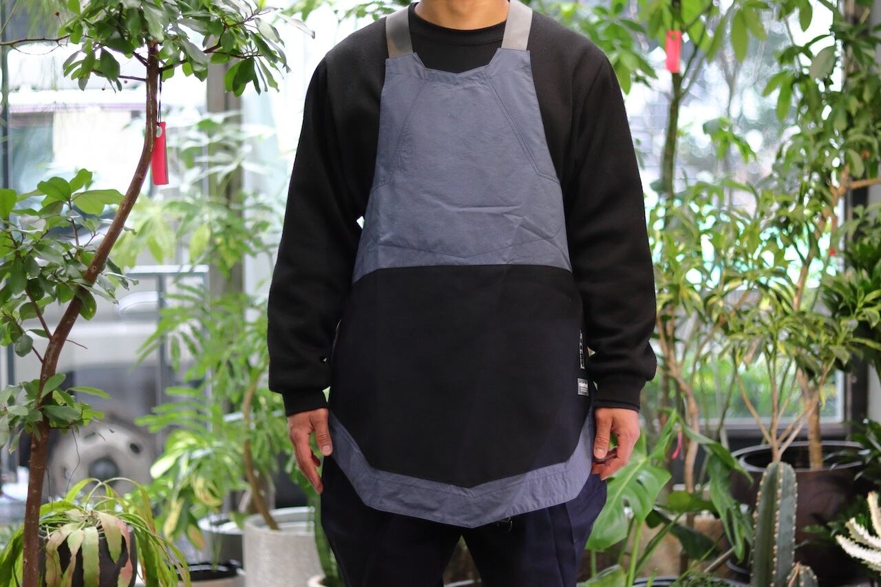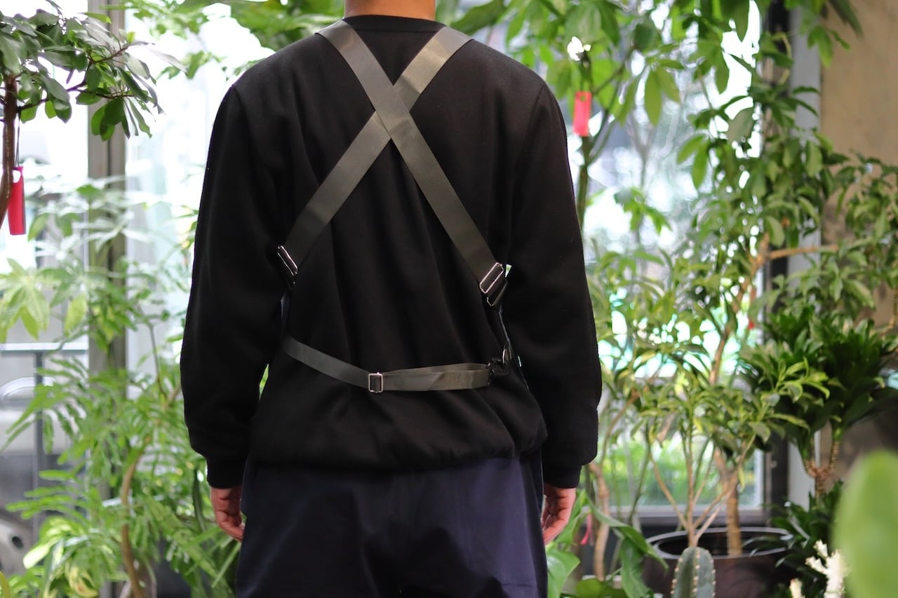 MAKERHOOD別注の庭師用の腹掛け。小ポケットは胸部に移動し、荷物を持った際の腹部は生地を二重に補強。肩が凝らないように、たすき掛けの寸法でショルダーストラップを設けています。