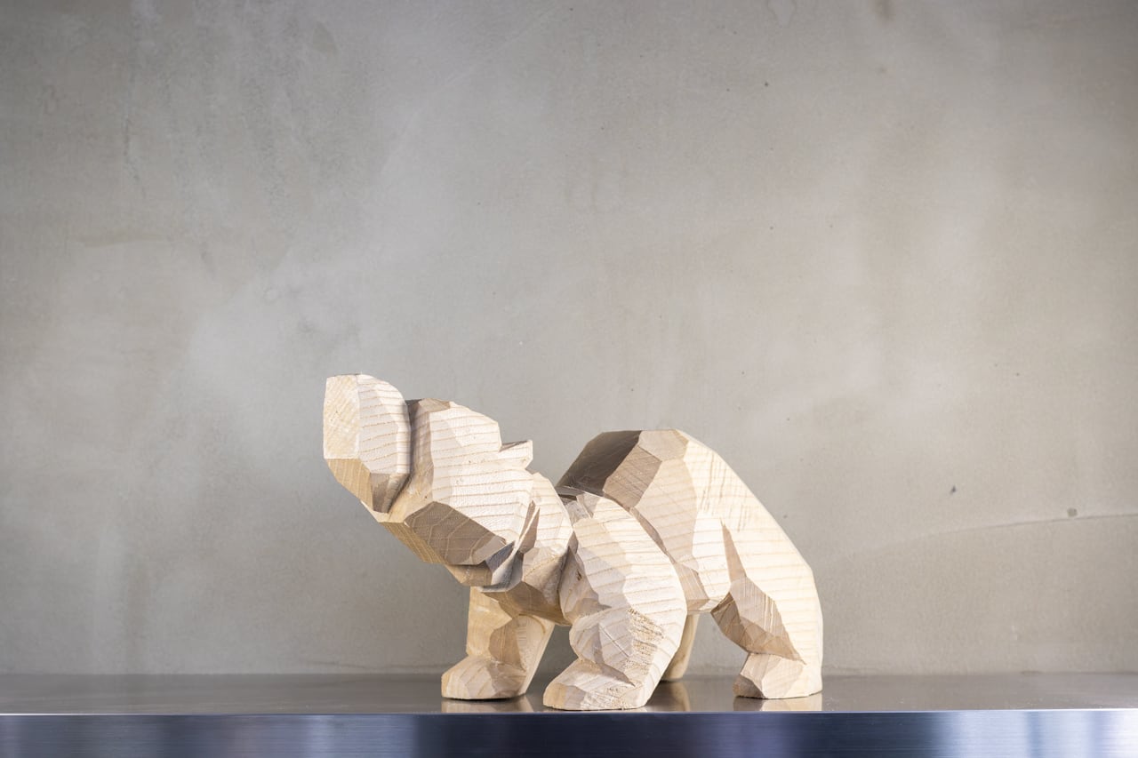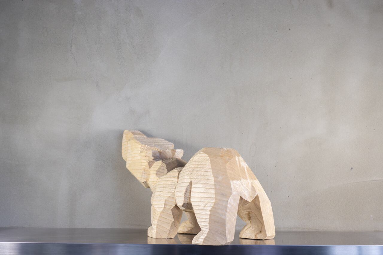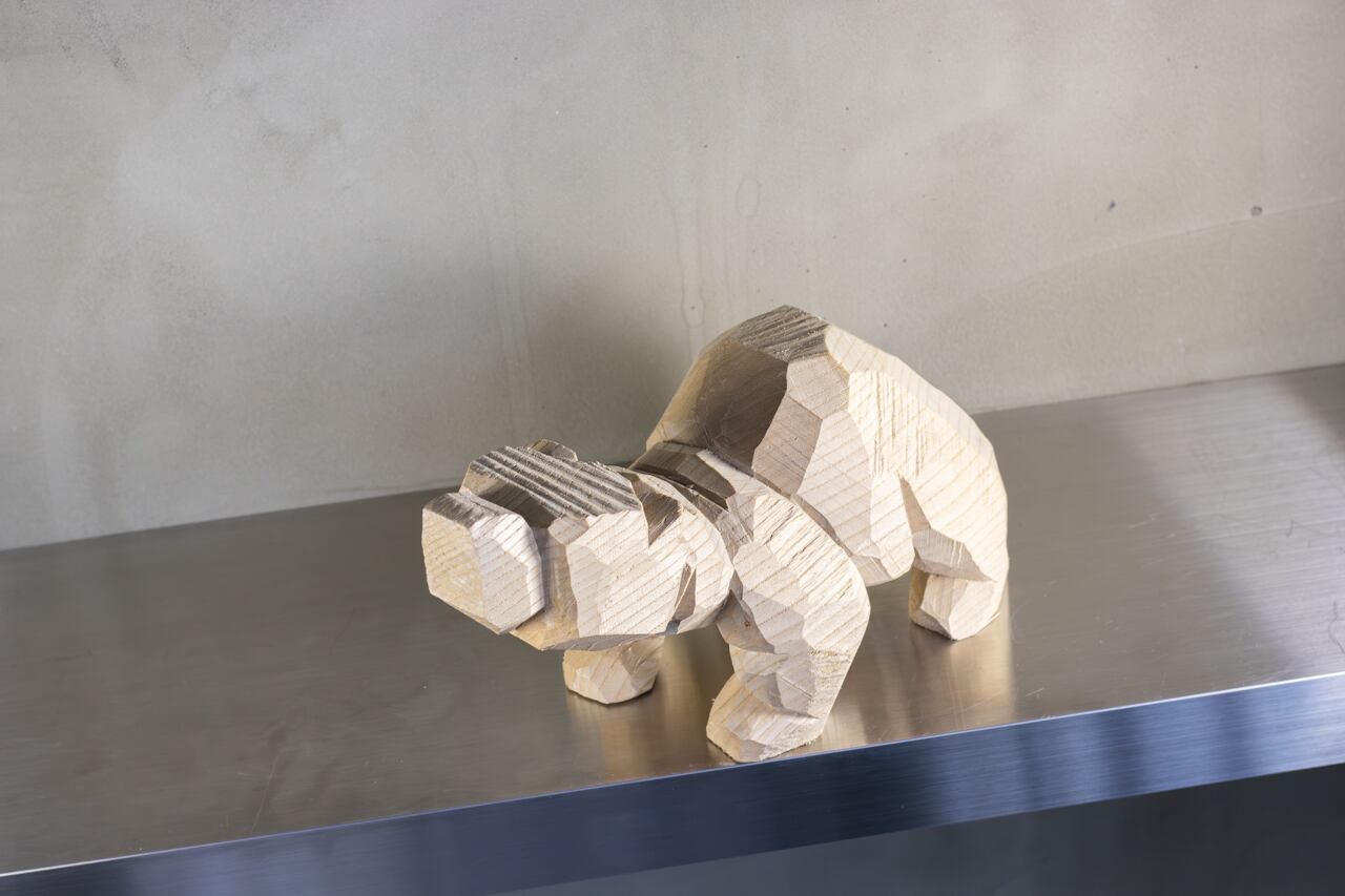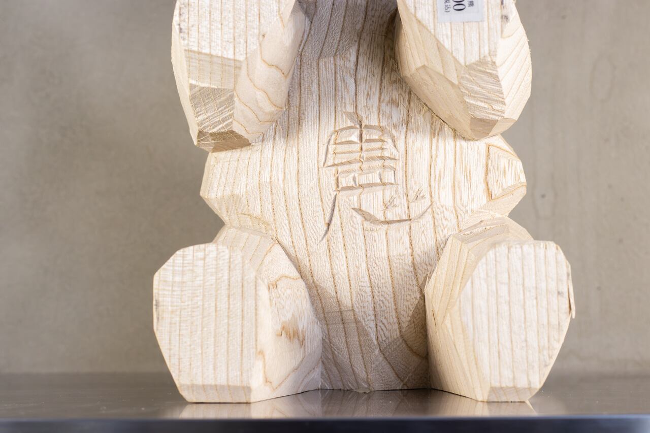 北海道旭川の巨匠彫刻家 佐藤憲治さん。這い熊は、重量感のある迫力にまるっとした手足が可愛らしい木彫り熊です。