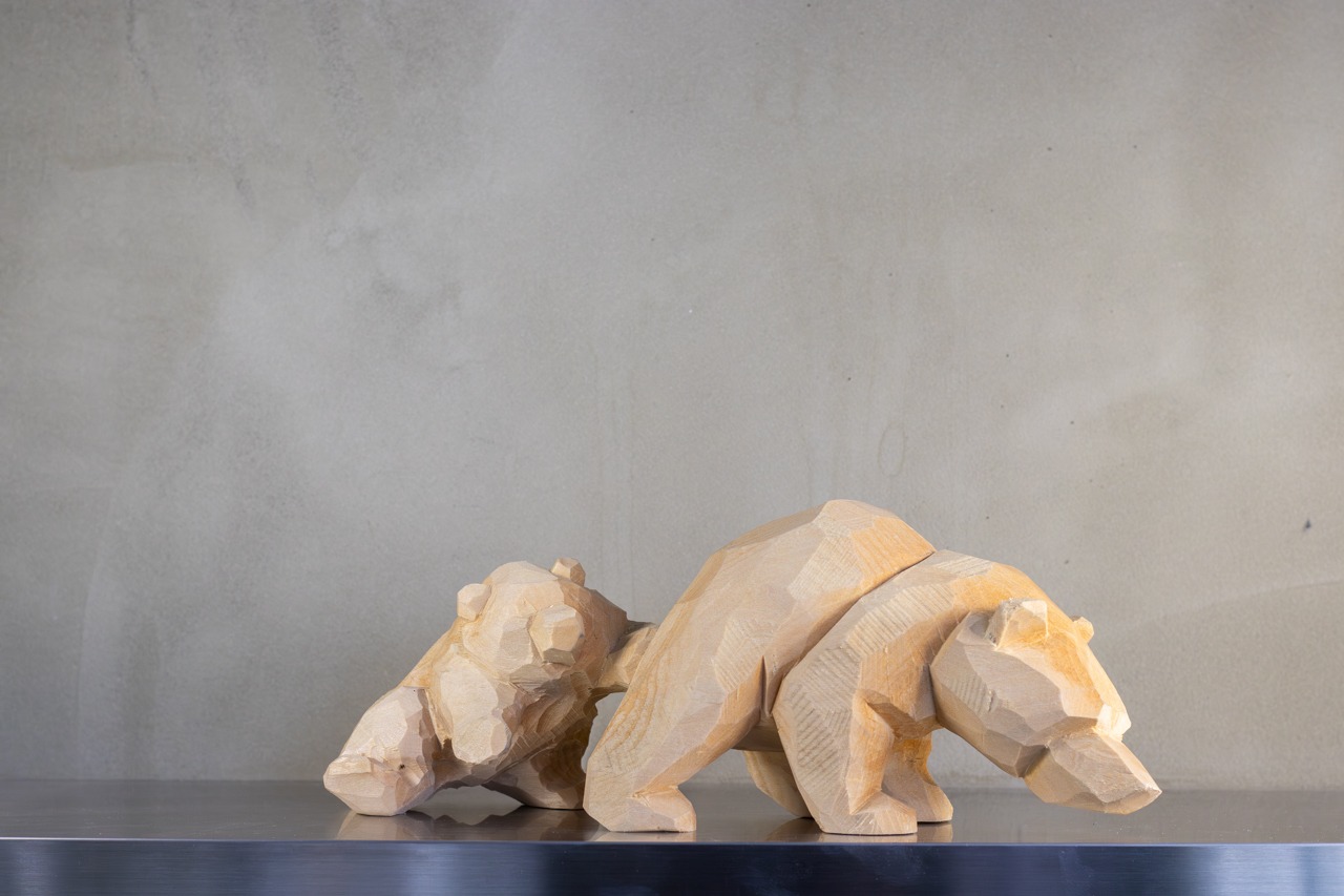 北海道旭川の巨匠彫刻家 佐藤憲治さん。親子熊は、母親熊にピッタリとくっついている小熊が愛らしい木彫り熊です。