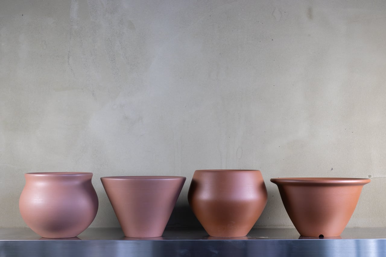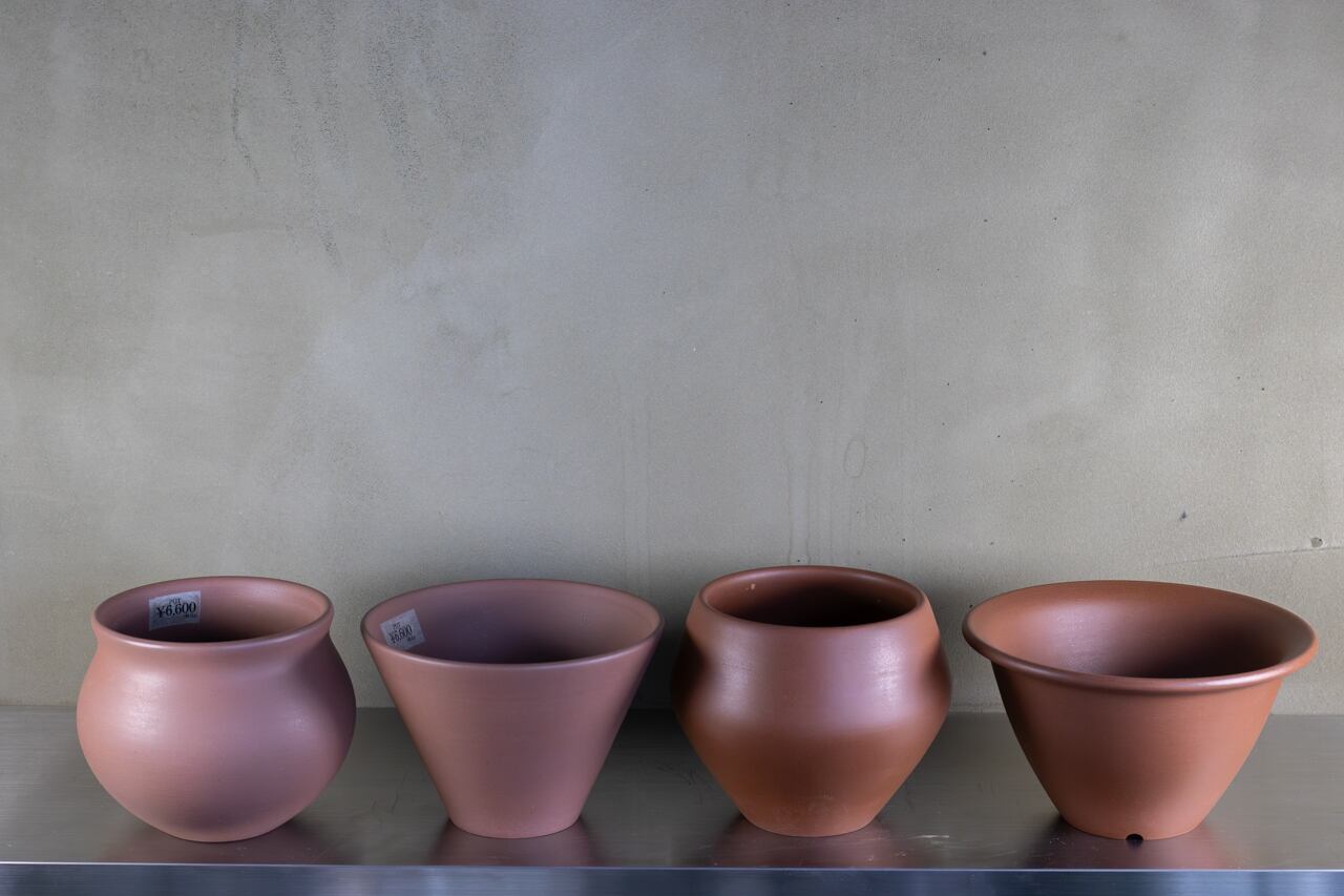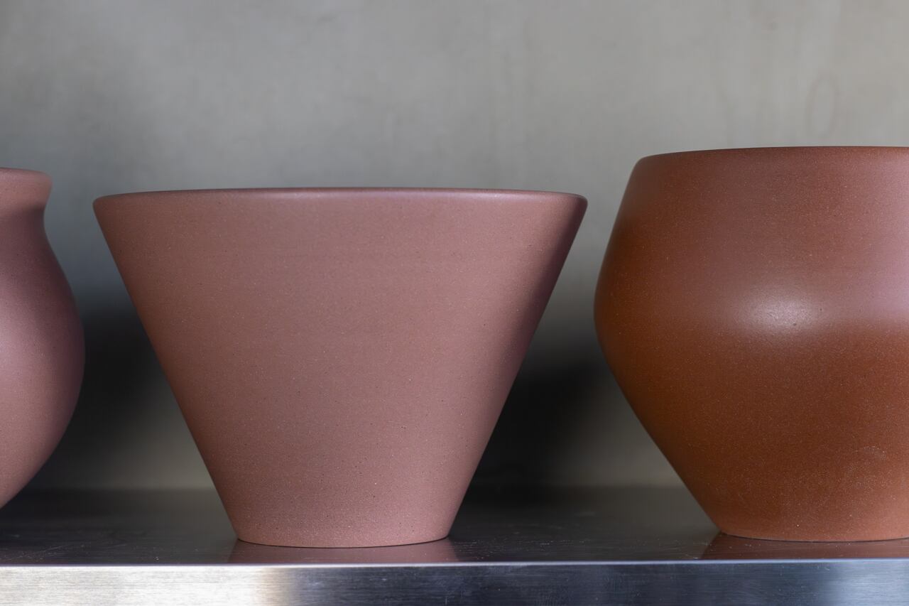釉薬を使わず土のみで作られる焼締めの作品を中心に制作されています。ろくろ成形で一つ一つ作られており、表面は各工程で磨きを施すことにより手触りの良い質感に仕上がっています。黒い土の作品は炭化による色付けがされています。