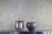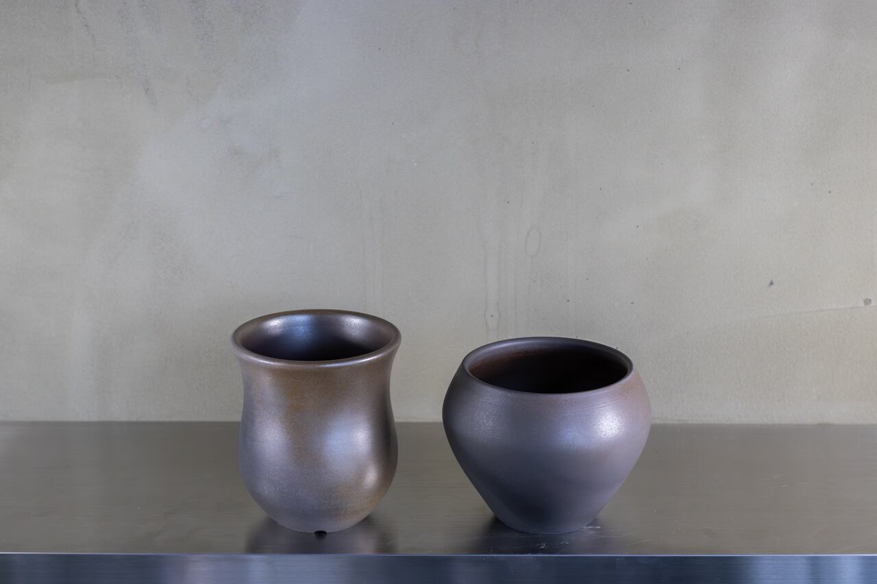 釉薬を使わず土のみで作られる焼締めの作品を中心に制作されています。ろくろ成形で一つ一つ作られており、表面は各工程で磨きを施すことにより手触りの良い質感に仕上がっています。黒い土の作品は炭化による色付けがされています。